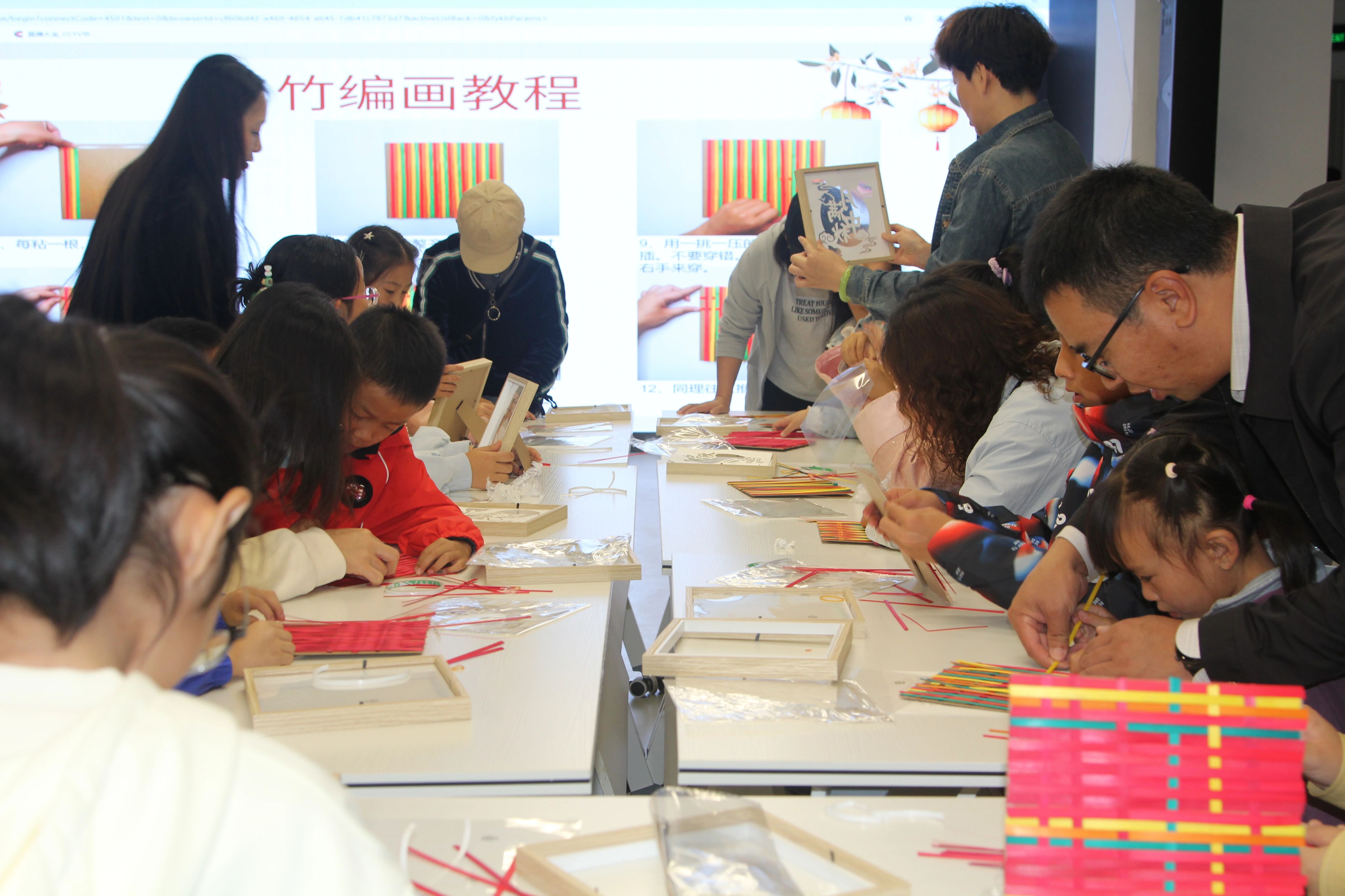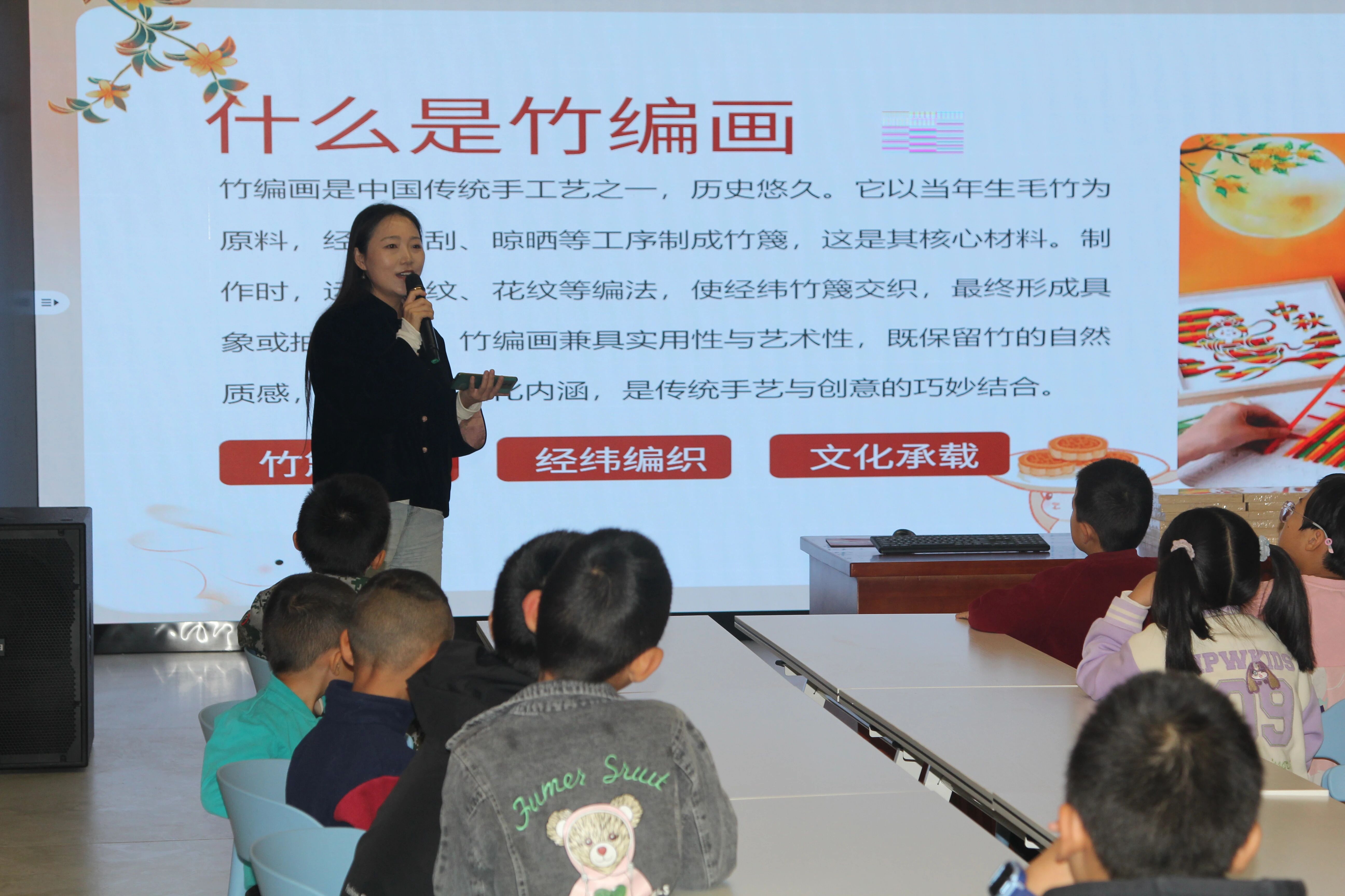 在竹编画创作环节。小读者们边听老师讲解竹编的基本方法,边拿起柔软的竹篾,采用经纬编织法进行创作。