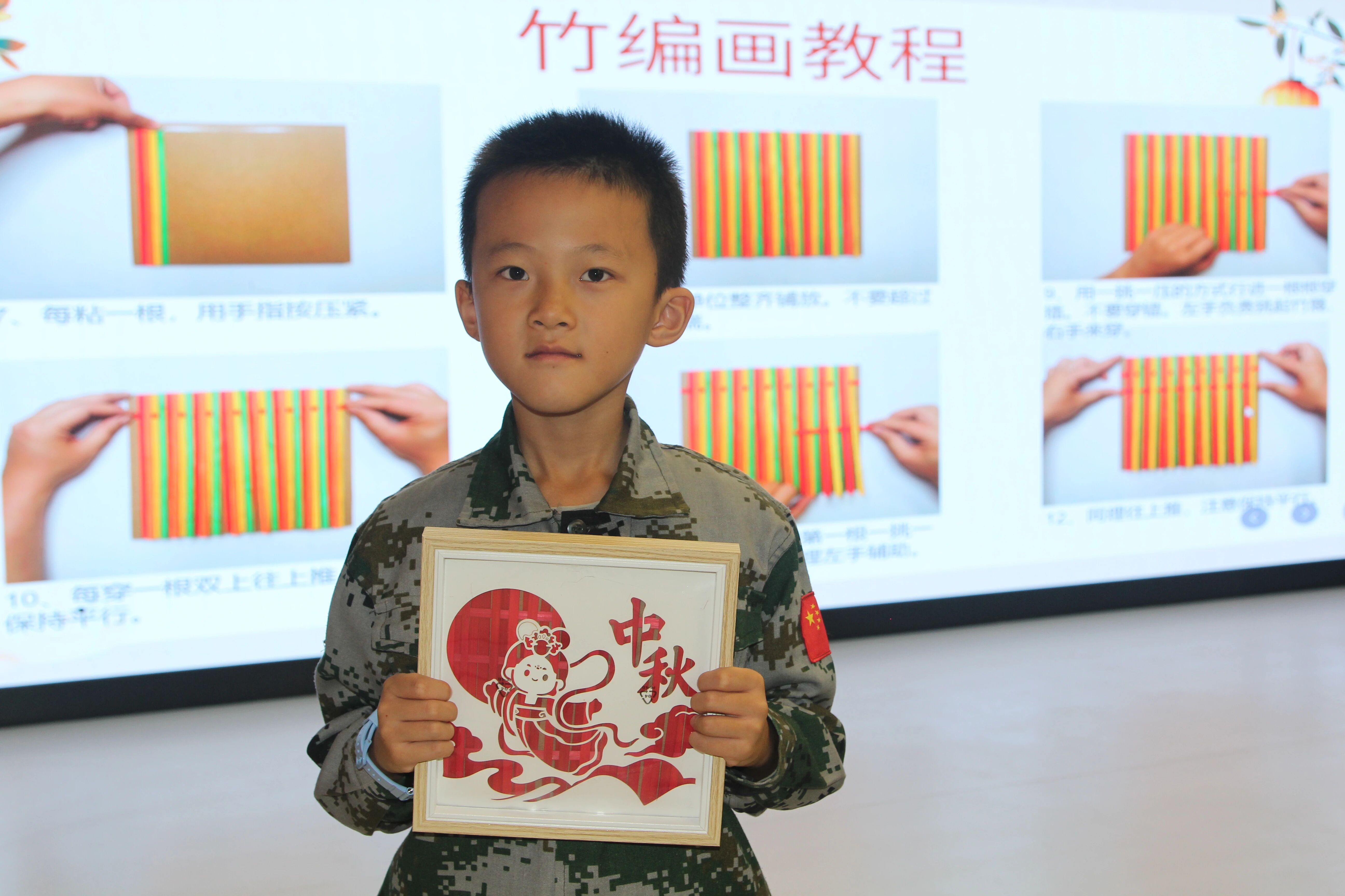大家先在垂直方向上,将代表经线的竹篾排列固定在底板的一边,然后在水平方向上采取挑、压、穿、扭等技法,编出纵横有致的彩色底纹,再将刻有满月、玉兔和嫦娥的镂空画面覆于其上,一幅幅独具匠心的竹编镜框画便在手中逐渐成形。孩子们捧着自己的作品,脸上满是成就感。