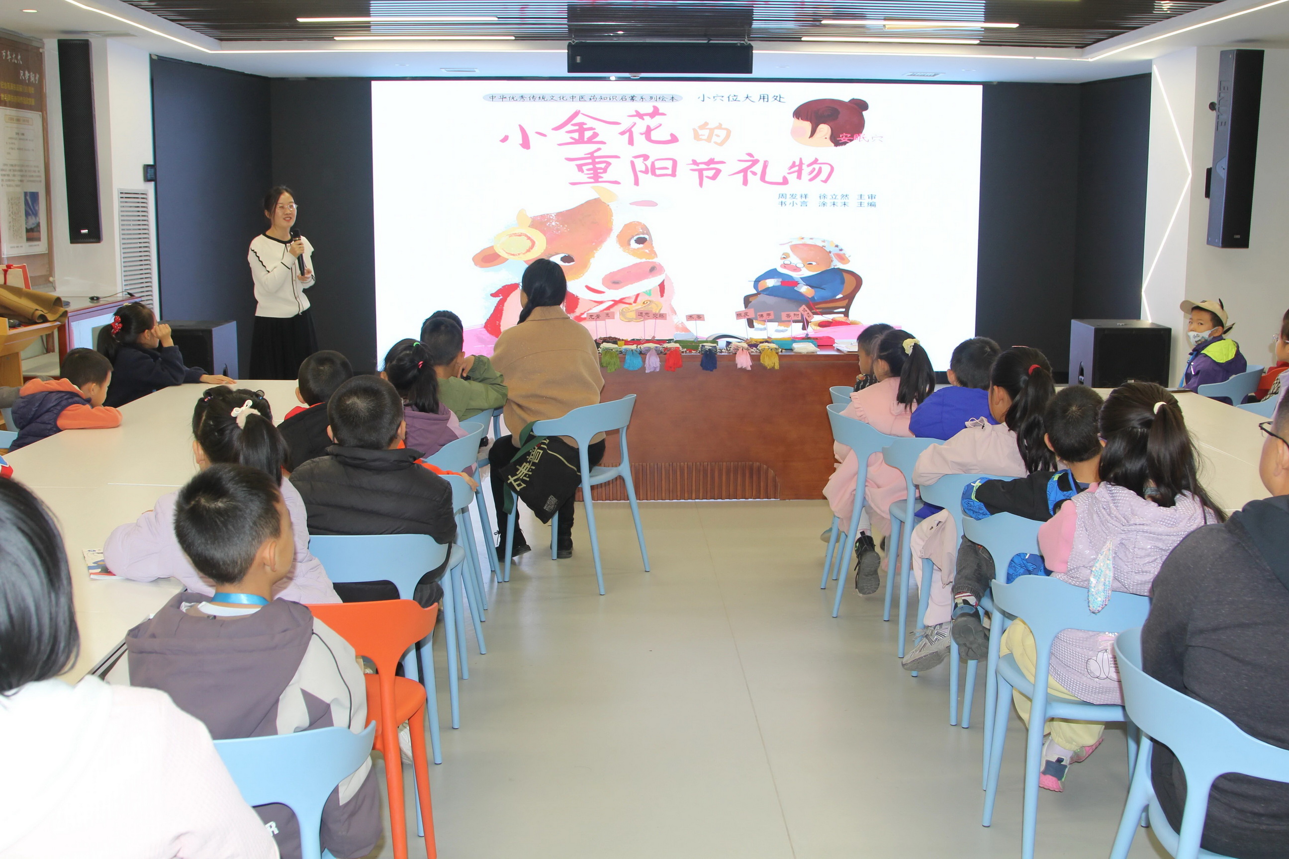 活动一开始,馆员老师为小读者讲述了绘本故事《小金花的重阳节礼物》。主人公“小金花”为外婆精心准备礼物的心愿和行动,深深吸引了大家,潜移默化地将尊老、爱老、敬老的种子播撒在小读者心中。孩子们在故事中读懂了要将“孝心”主动转化为“孝行”的道理,并积极举手参与互动,说出自己对长辈的重阳节祝福。