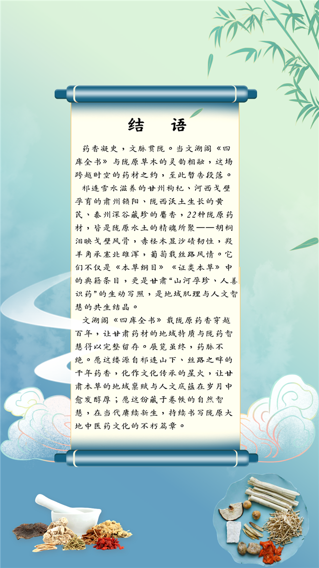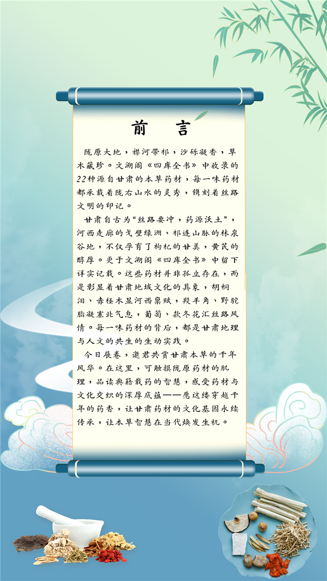 本次展览以文溯阁《四库全书》中收录的22种甘肃药材为核心依托,旨在通过多元展陈形式,结合文溯阁相关典籍中关于陇地药材的图片,系统梳理陇药的文献记载,展现陇药与中华传统医药文化、甘肃地域文化的深度交融,让观众感知陇药背后的历史厚度与文化温度,为赓续陇药文化的传承注入文化动力。